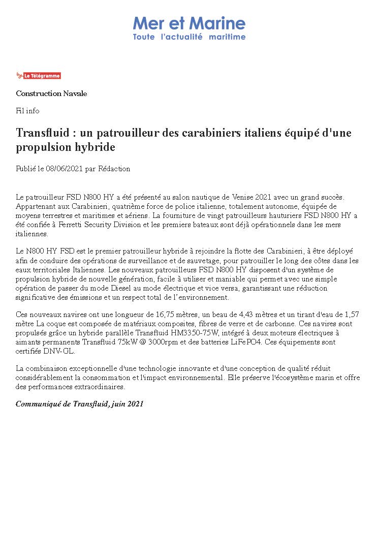 CARABINIERI PATROL BOAT WITH TRANSFLUID HYBRID SYSTEM Press June 9, 2021 00:00 Peakweb THE FIRST HYBRID-POWERED CARABINIERI PATROL BOAT ON DISPLAY IN VENICE Mer et Marine 08June 2021