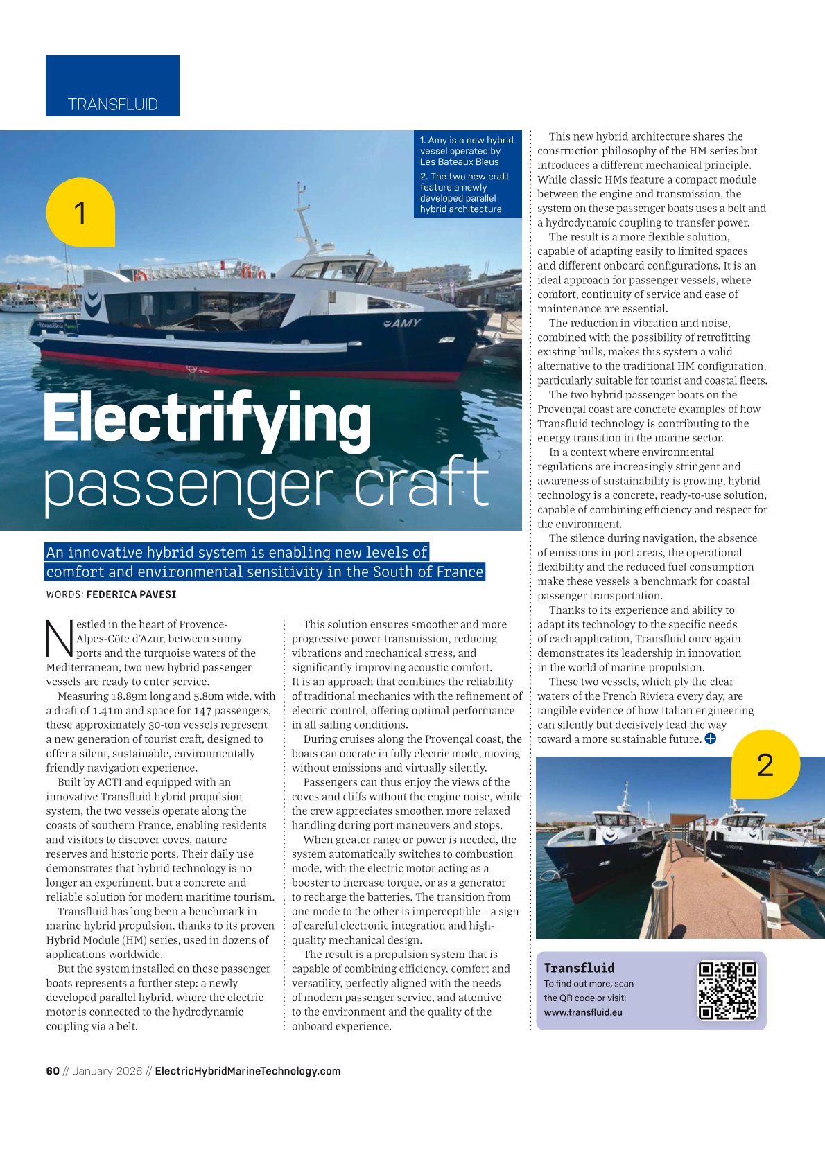 a new generation of tourist craft, designed to offer a silent, sustainable, environmentally friendly navigation experience. Built by ACTI and equipped with an innovative Transfluid hybrid propulsion system, the two vessels operate along the coasts of southern France, enabling residents and visitors to discover coves, nature reserves and historic ports. Their daily use demonstrates that hybrid technology is no longer an experiment, but a concrete and reliable solution for modern maritime tourism.