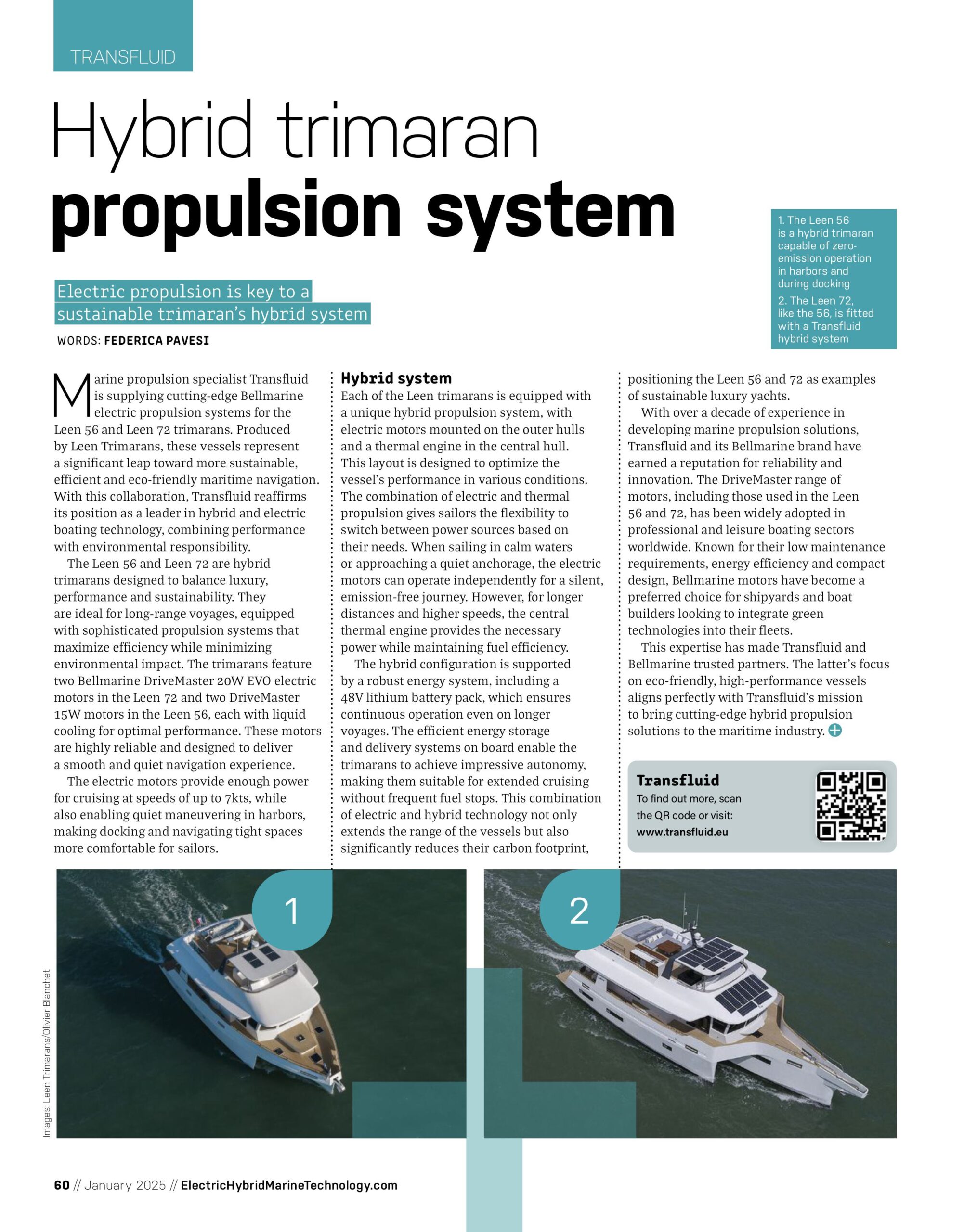 Marine propulsion specialist Transfluid is supplying cutting-edge Bellmarine electric propulsion systems for the Leen 56 and Leen 72 trimarans. Produced by Leen Trimarans, these vessels represent a significant leap toward more sustainable, efficient and eco-friendly maritime navigation.