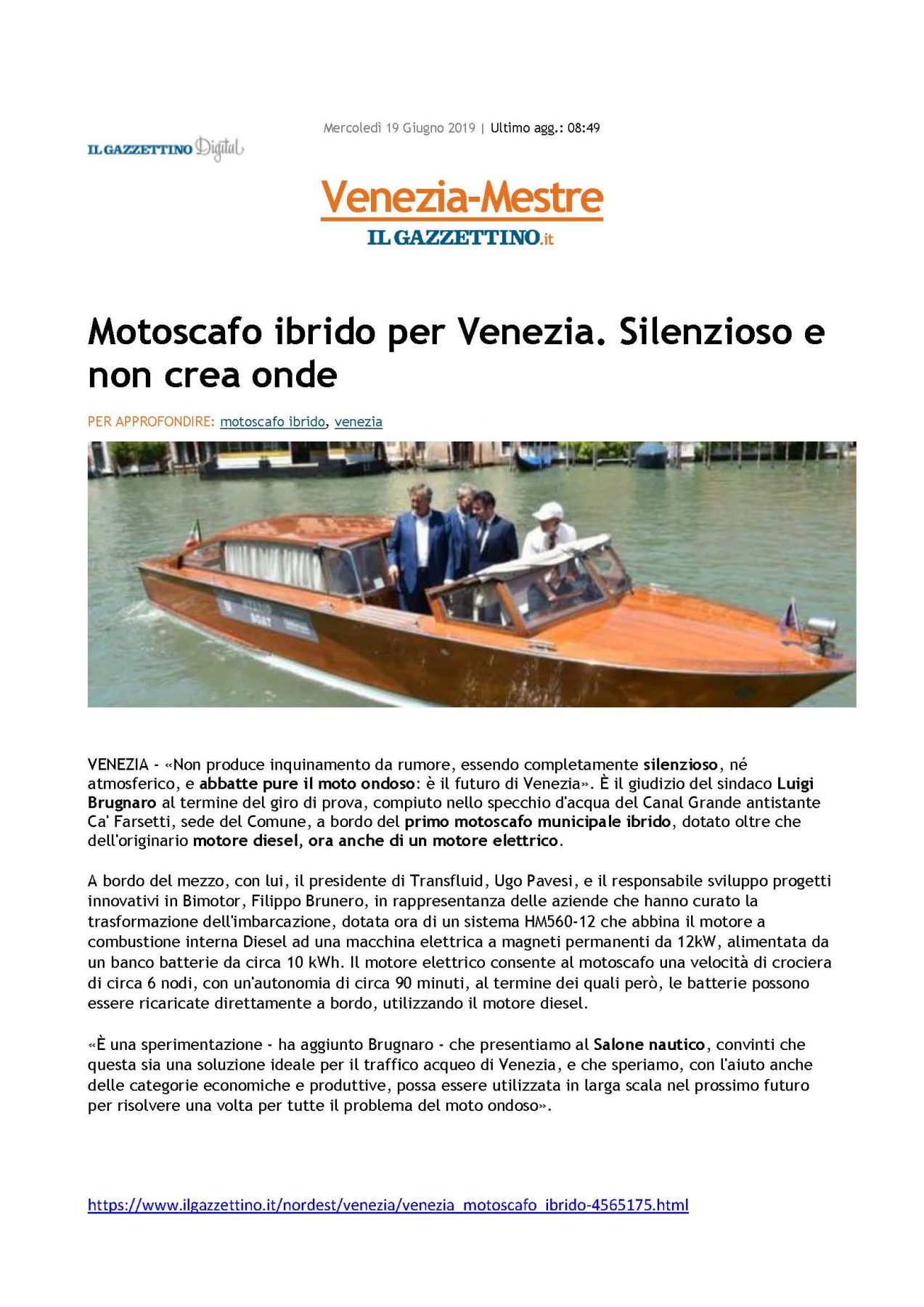 Hybrid water taxi delivered to Venice Press June 25, 2019 00:00 Peakweb Hybrid vessel for Venice. It’s quiet and produces zero waves Il Gazzettino di Venezia 19.06.2019