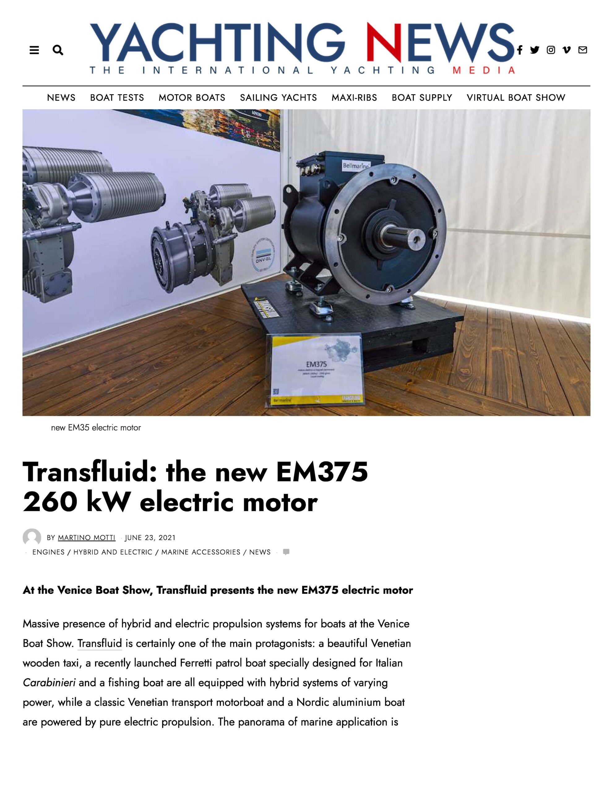 THE NEW ELECTRIC MOTOR EM375 BY TRANSFLUID Press June 30, 2021 00:00 Peakweb TRANSFLUID INTRODUCES THE NEW EM375 ELECTRIC MOTOR AT THE VENICE BOAT SHOW