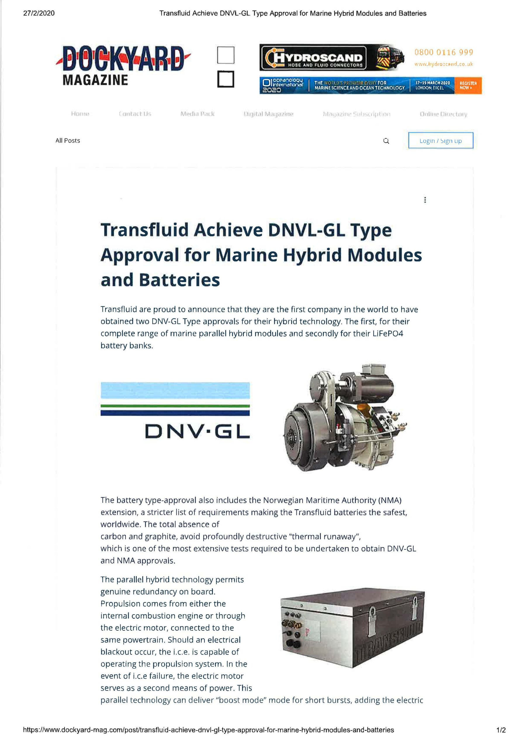 Transfluid receives DNV-GL approval for it’s Hybrid modules and batteries Press July 15, 2020 00:00 Peakweb Transfluid is proud to announce they are the first company worldwide to obtain two DNV-GL Type certifications for their hybrid technology. Dockyard Magazine