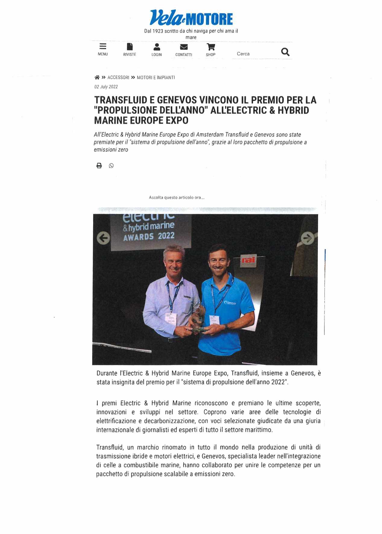 TRANSFLUID AND GENEVOS WIN THE “PROPULSION OF THE YEAR” AWARD AT THE ELECTIC & HYBRID MARINE EXPO Press July 13, 2022 00:00 Peakweb